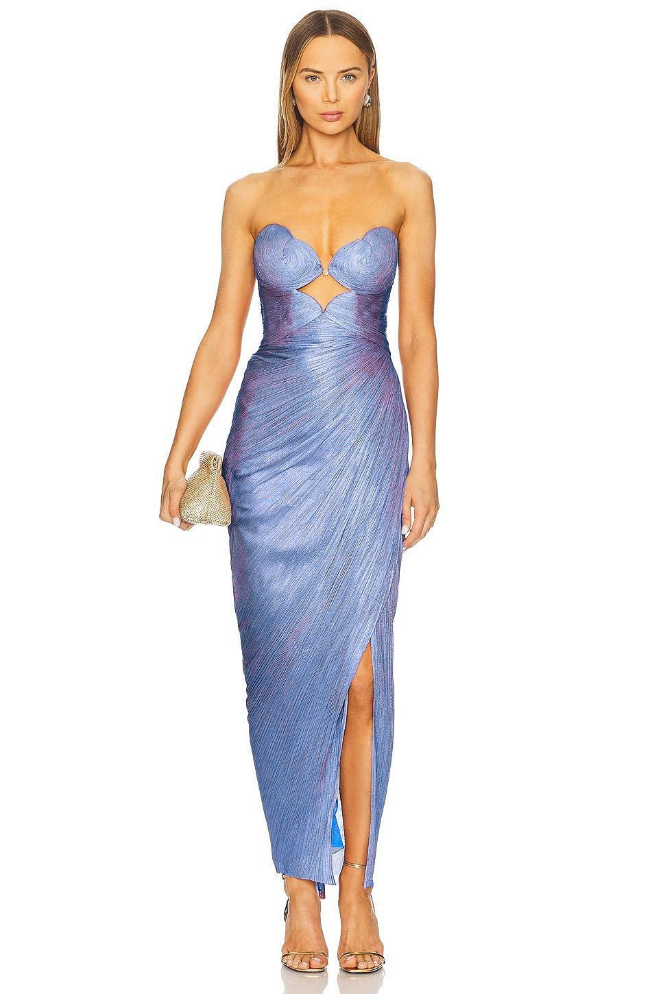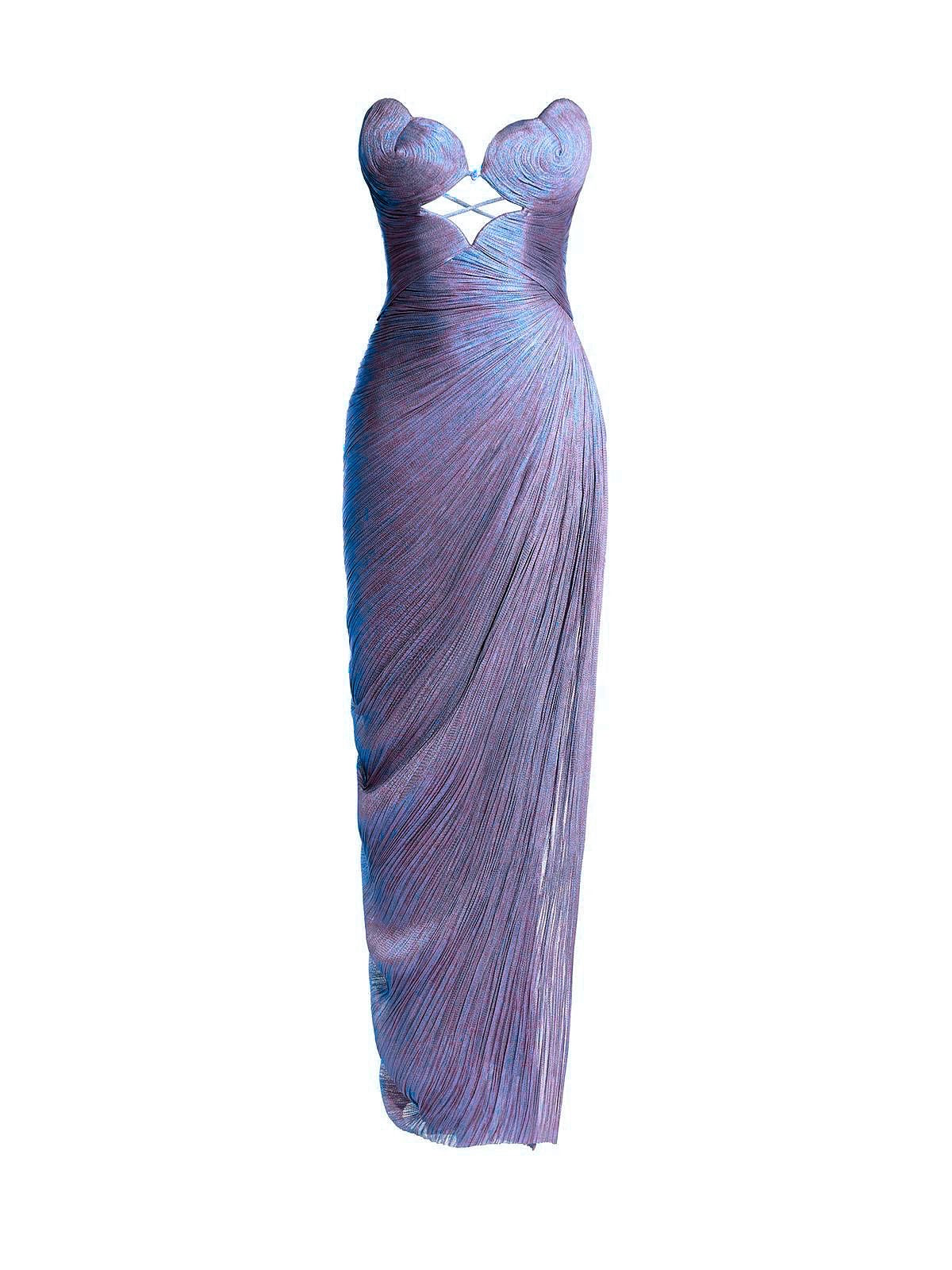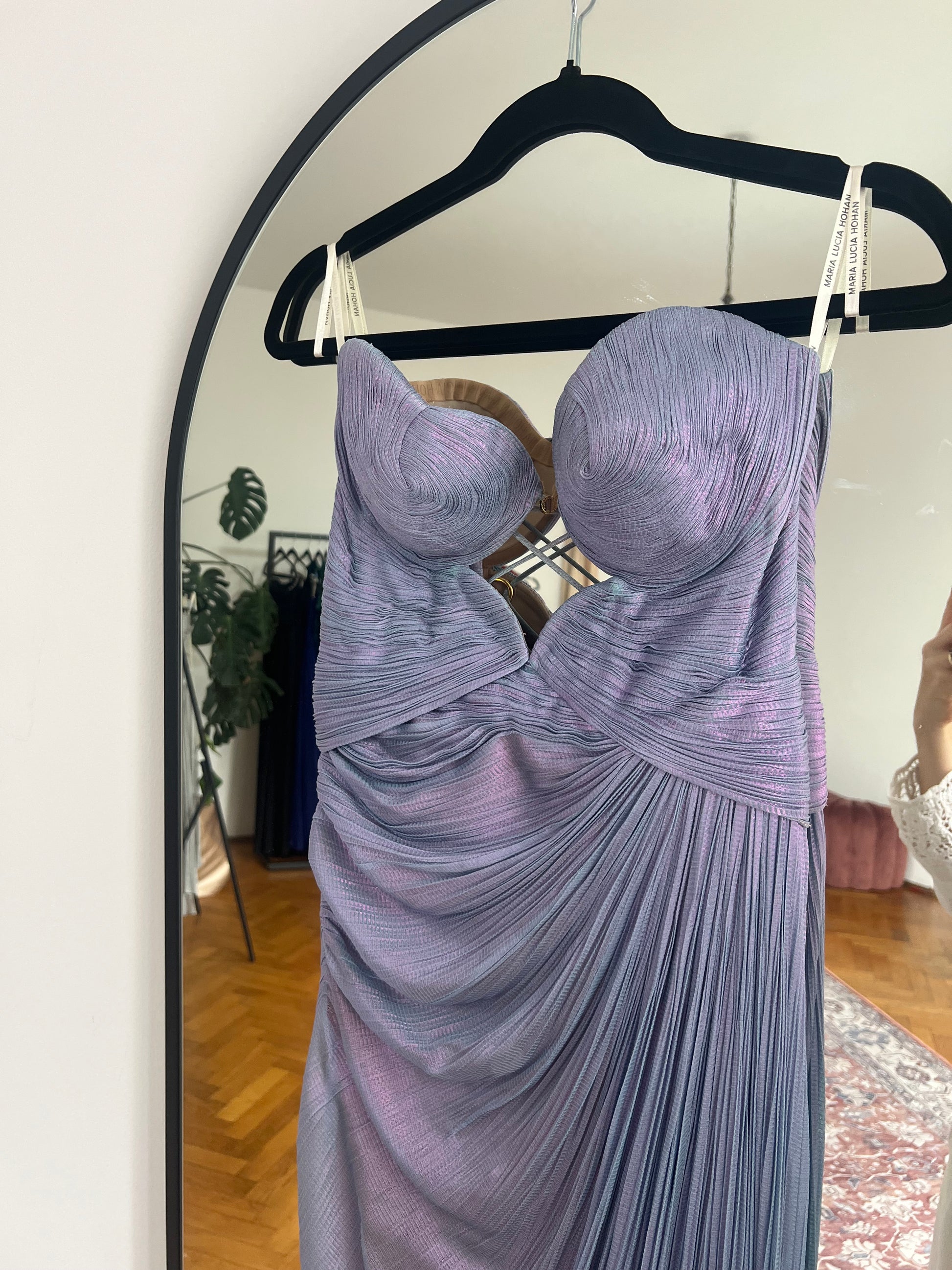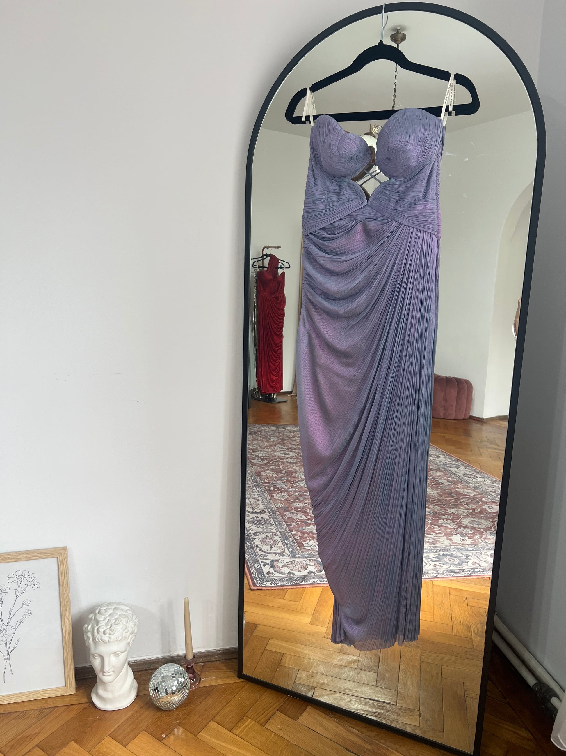 Un simbol al feminității și al rafinamentului, această rochie semnată Maria Lucia Hohan cucerește prin armonia dintre senzualitate și delicatețe. Realizată din tulle de mătase plisată cu irizații metalizate, piesa se remarcă prin jocul elegant al nuanțelor de lila, ce captează și reflectă lumina într-un mod spectaculos.