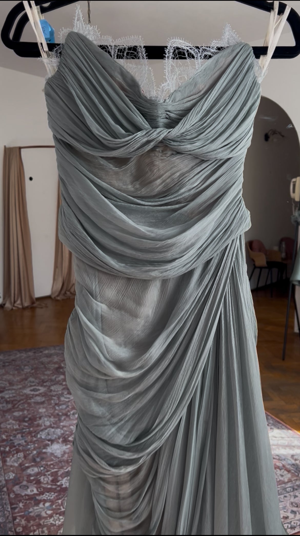 Măsura rochiei este 36FR, poate îmbrăca mărimea Xs și S, dimensiuni minime 84-64-NA, maxime 93-71-95. Rochia nu se închiriază sub înălțimea de 1,65+ toc10 cm.
