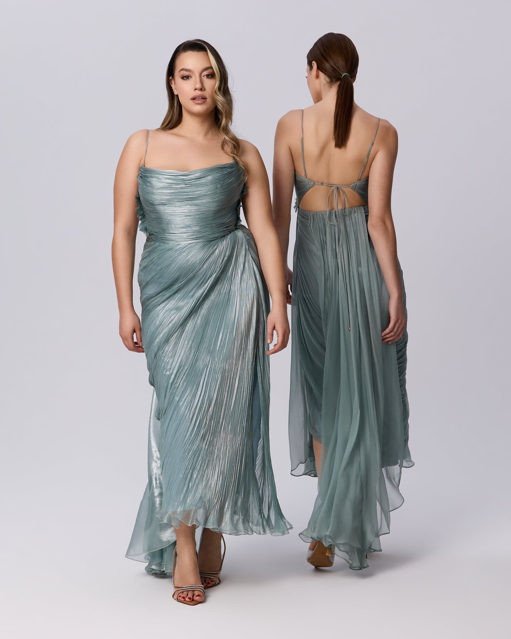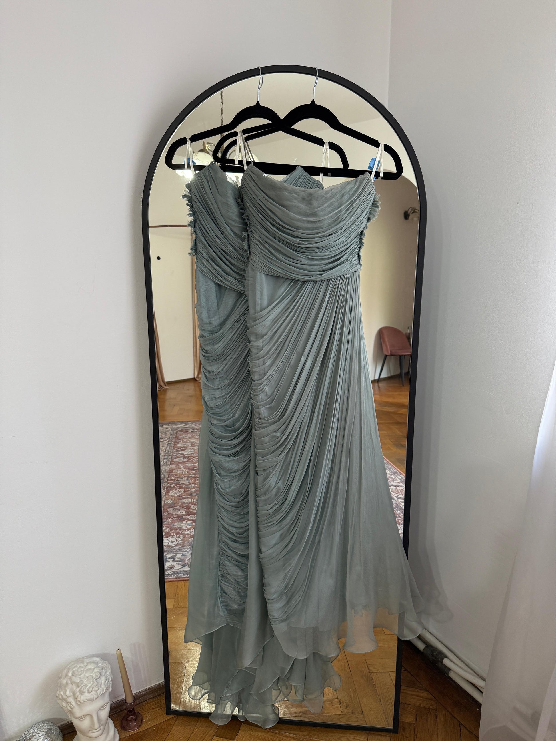 Mărimea M/L: 3% (rochia prezintă ușoare semne de utilizare: pliurile sunt mai relaxate, iar pelicula sidefată s-a atenuat în urma curățării profesionale. Aceste aspecte nu afectează aspectul general elegant al rochiei)