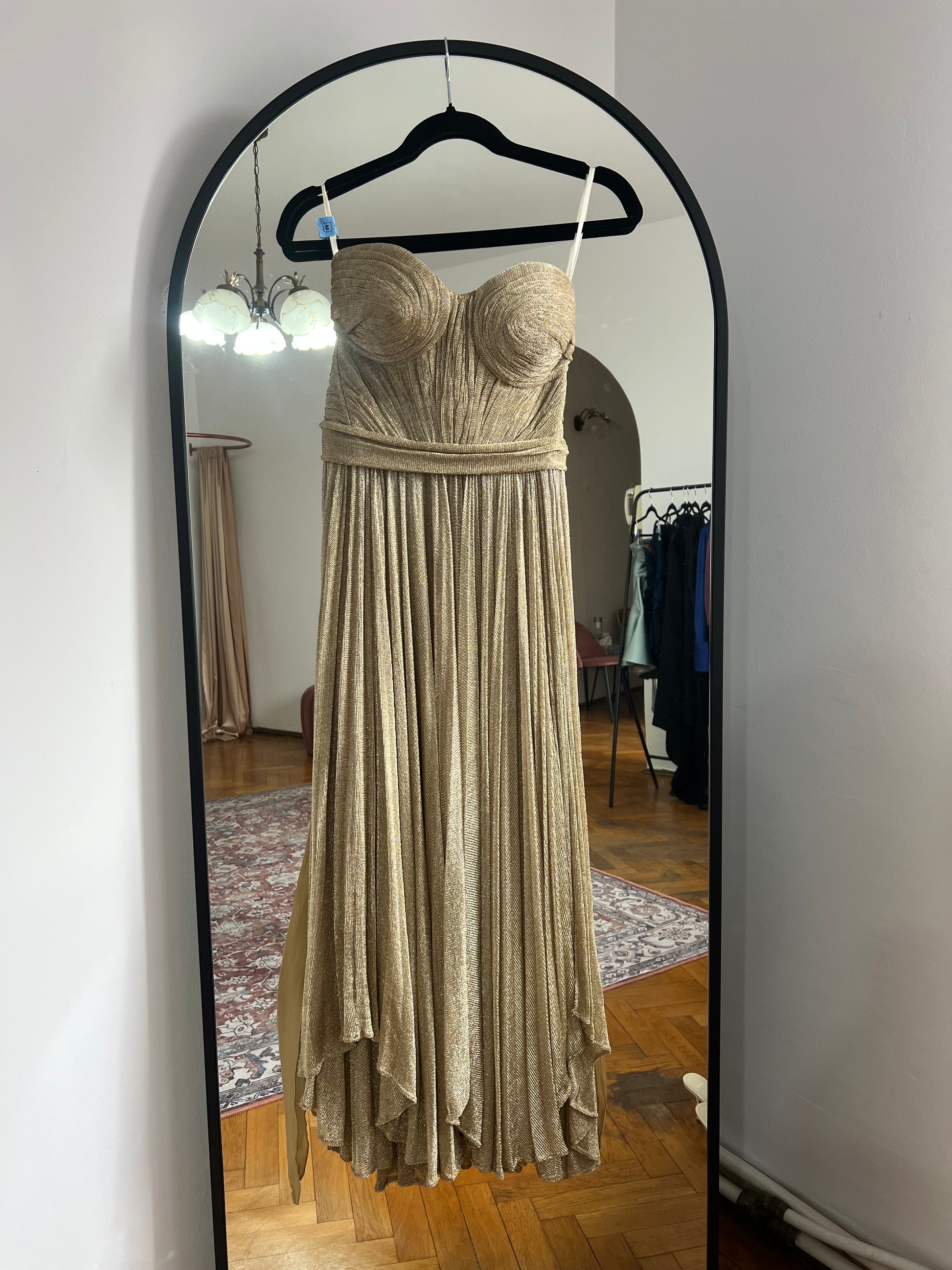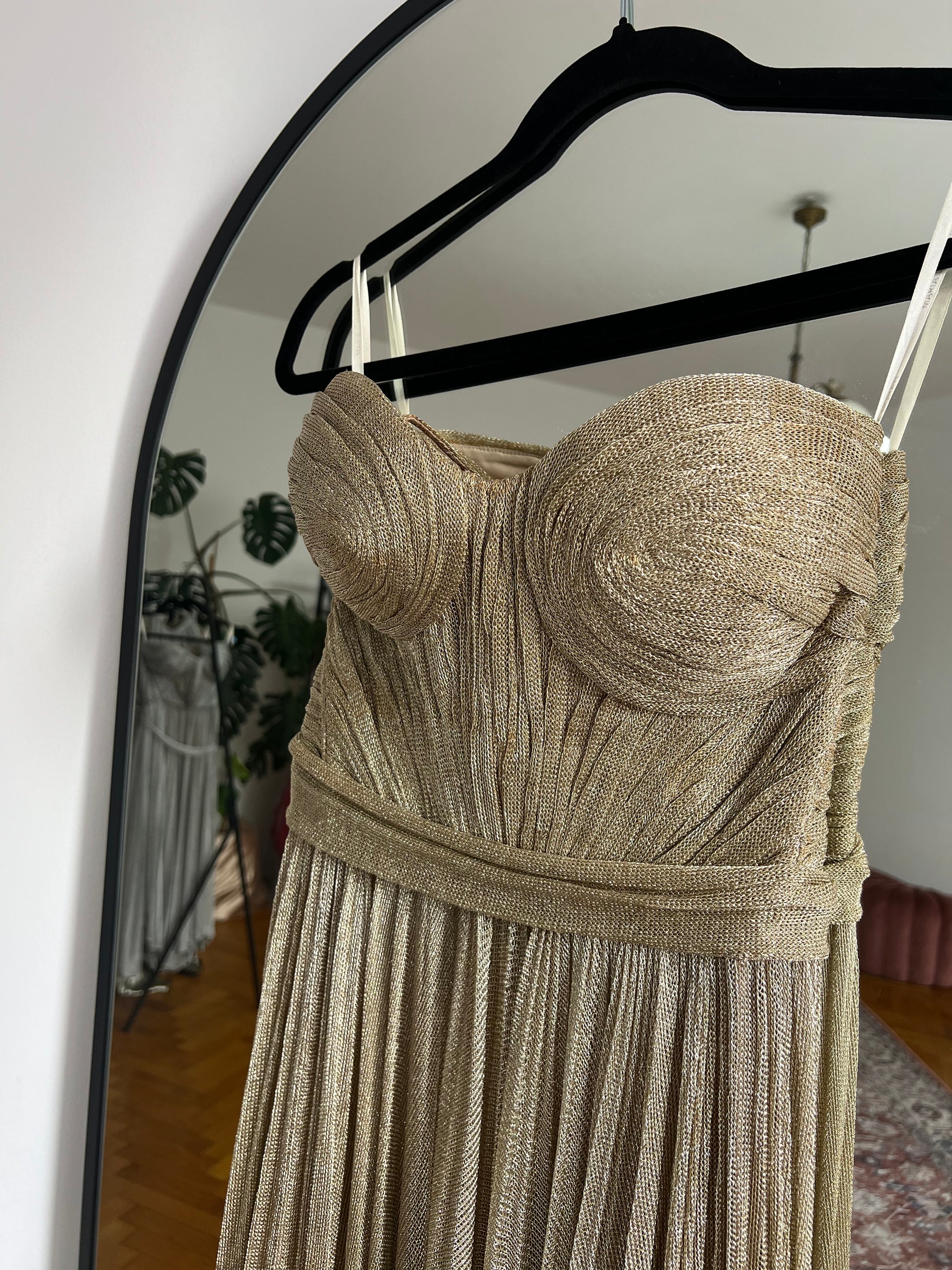Rochie Maria Lucia Hohan din țesătură metalizată cu corset integrat cu șnur la spate, bretele subțiri ajustabile și șliț înalt pe piciorul stâng. Corsetul rochiei este strâmt pe bust și în talie, partea inferioară a rochiei fiind largă, ușoară și vaporoasă. Dublura rochiei constă în jupă de culoarea pielii nedetașabilă.