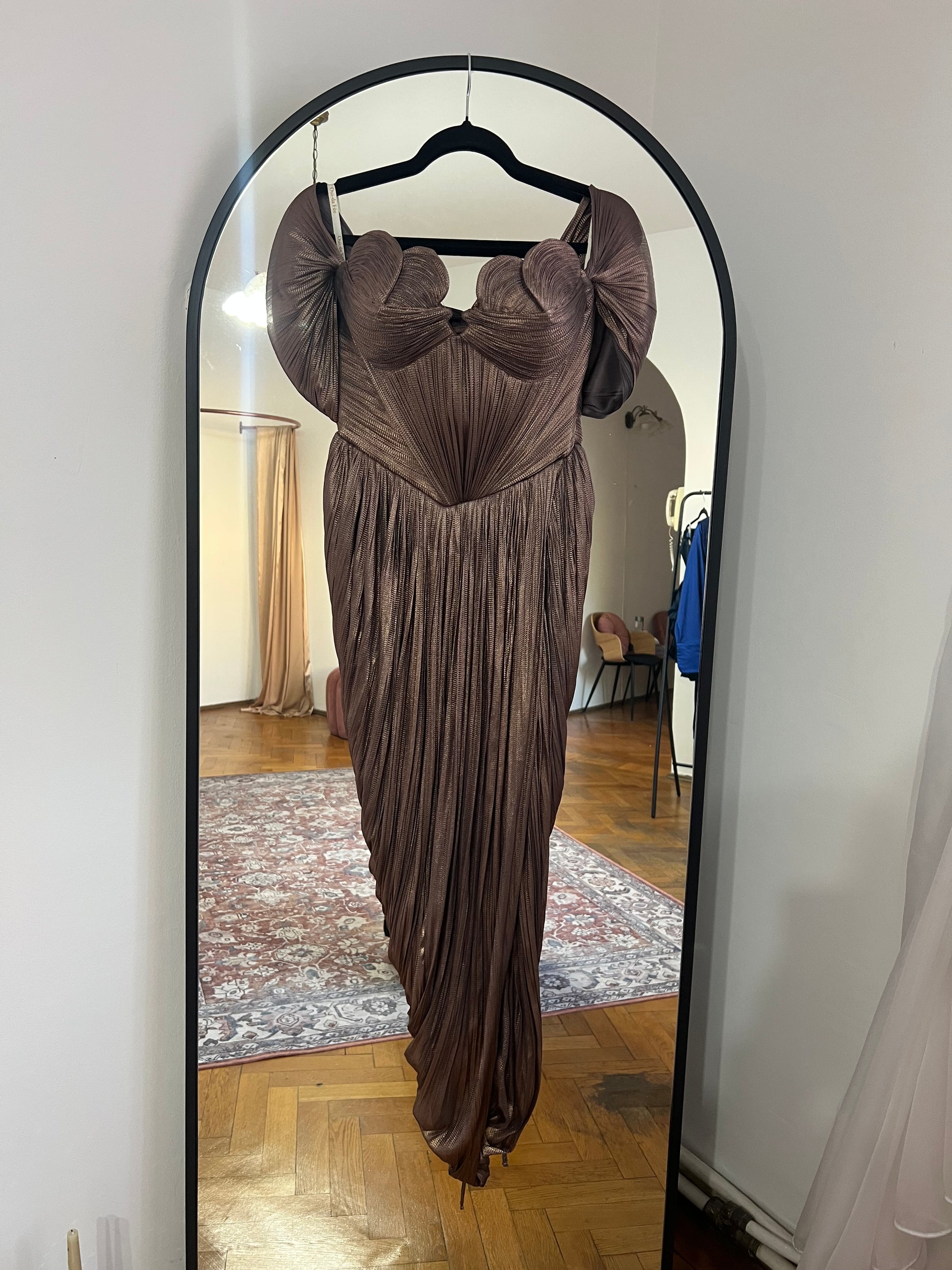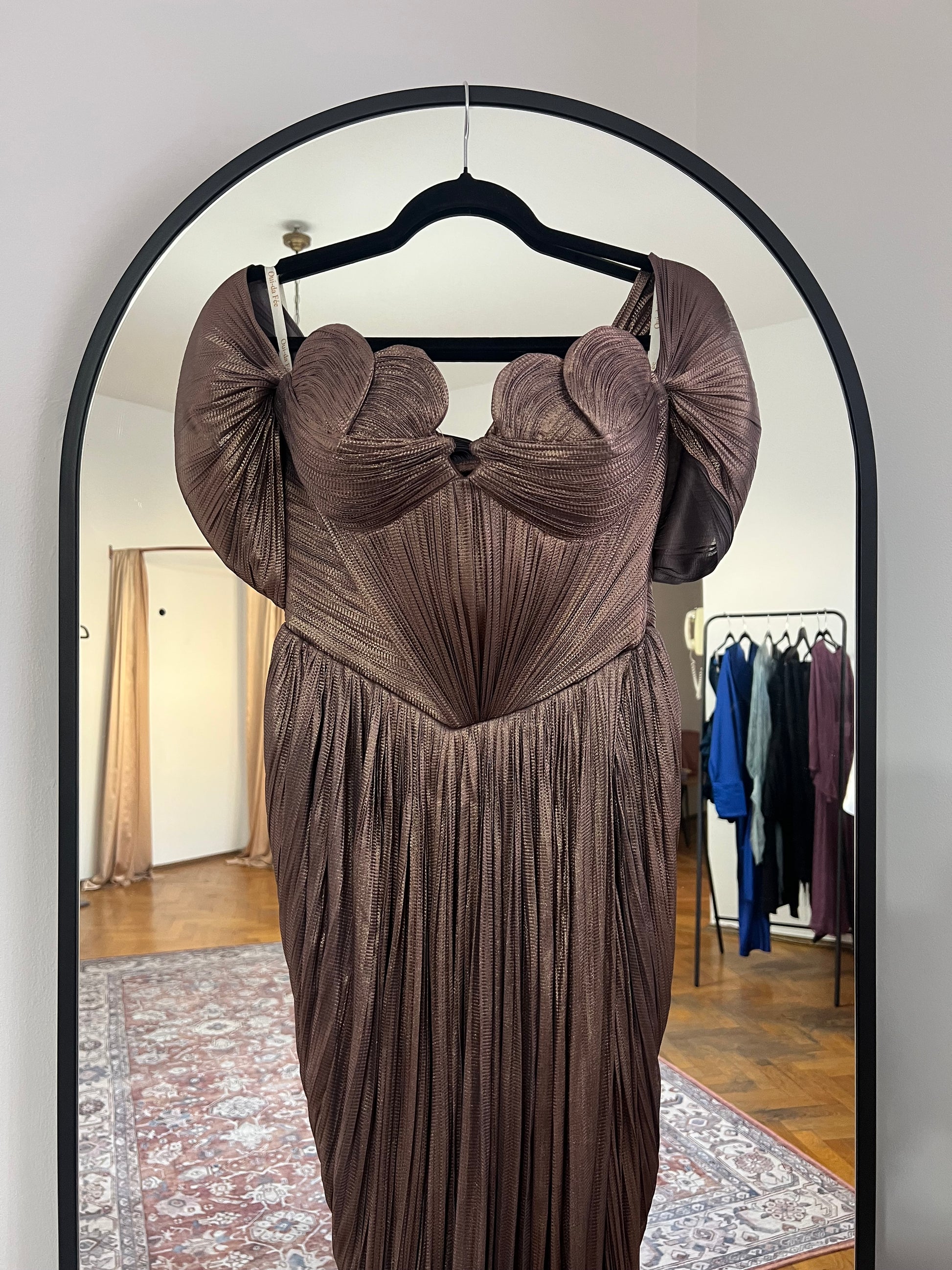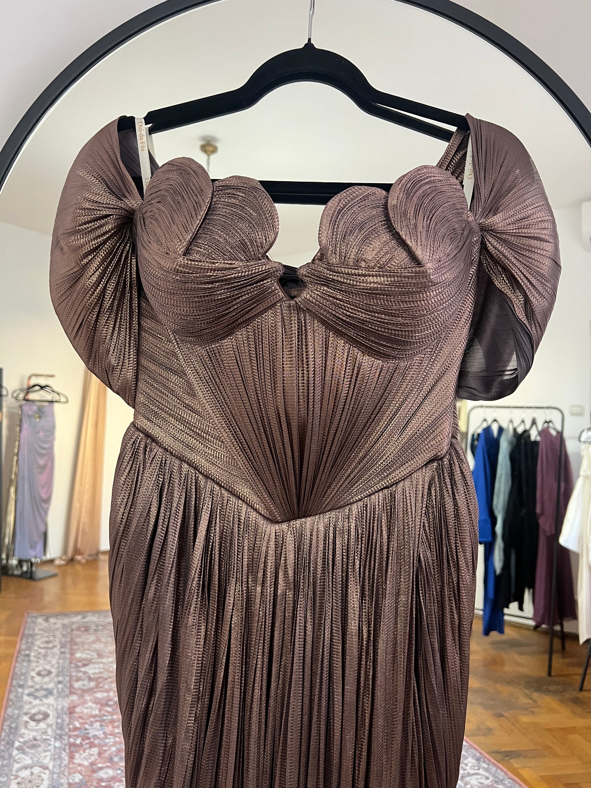 O reinterpretare modernă a eleganței clasice, această creație Oui-Da Fée impresionează prin arhitectura sa sculpturală și prin rafinamentul materialului. Realizată din tulle de mătase plisată cu finisaj metalizat, rochia dezvăluie profunzimea unei nuanțe calde de ciocolatiu, ce captează subtil lumina.