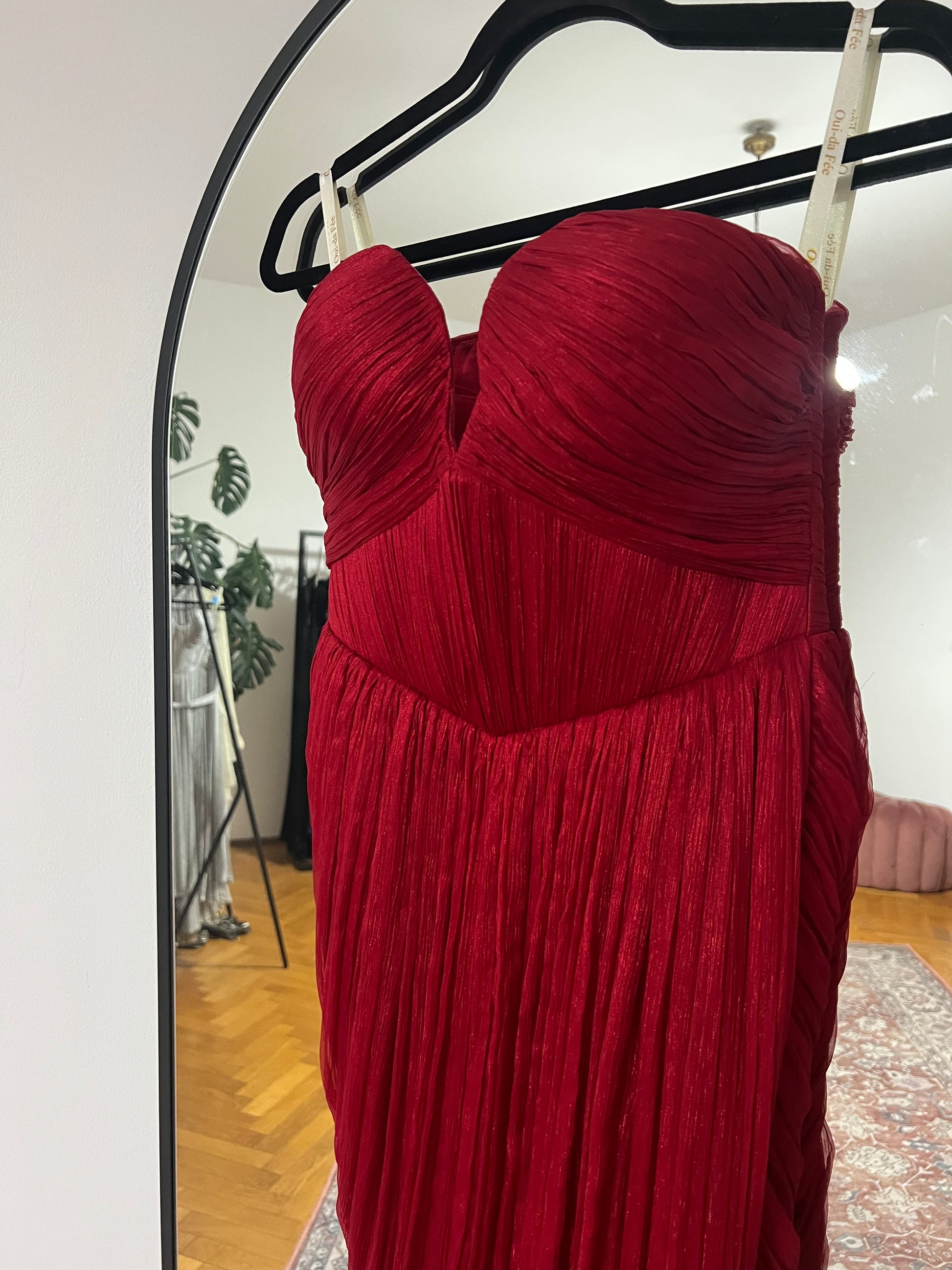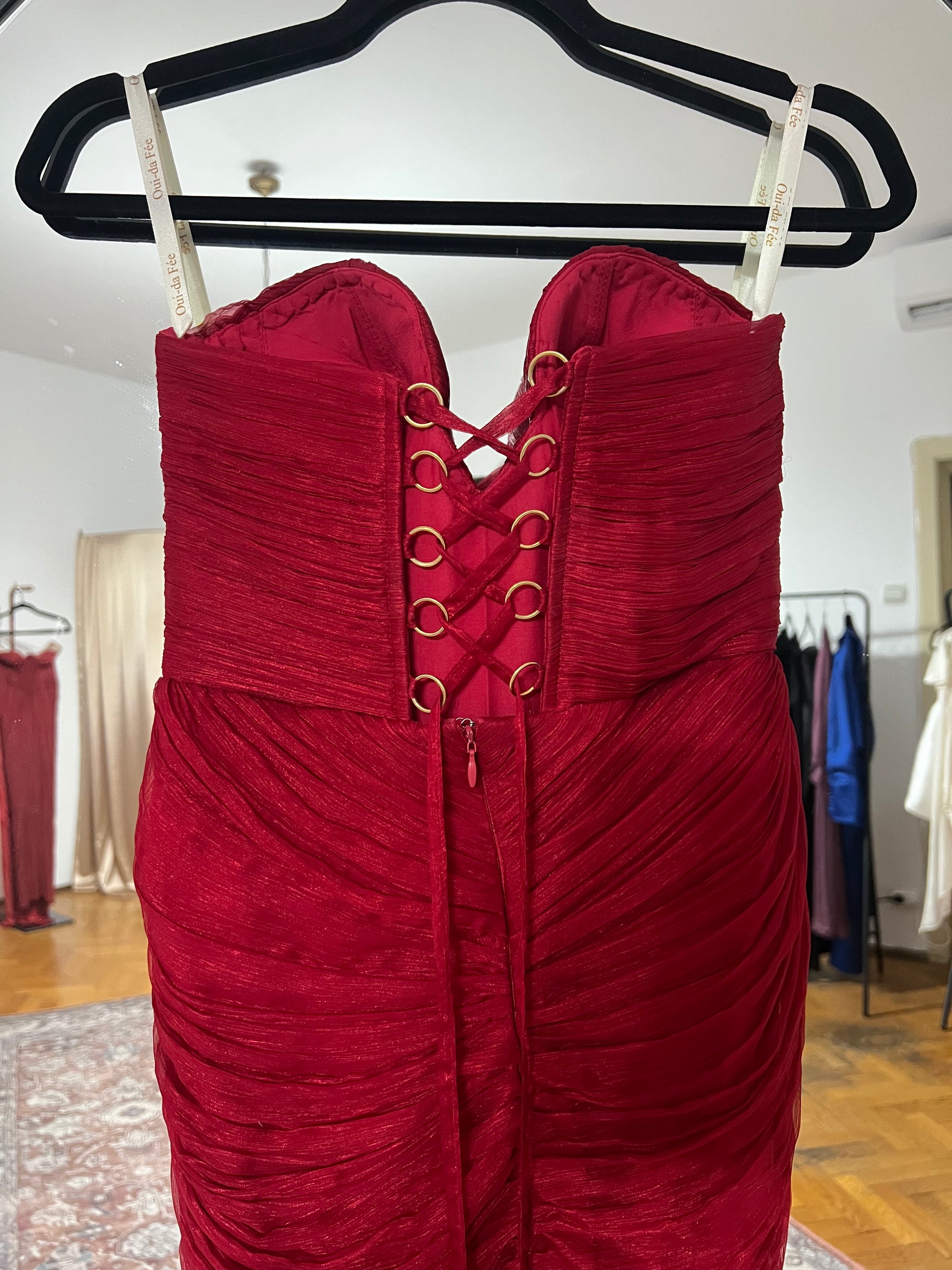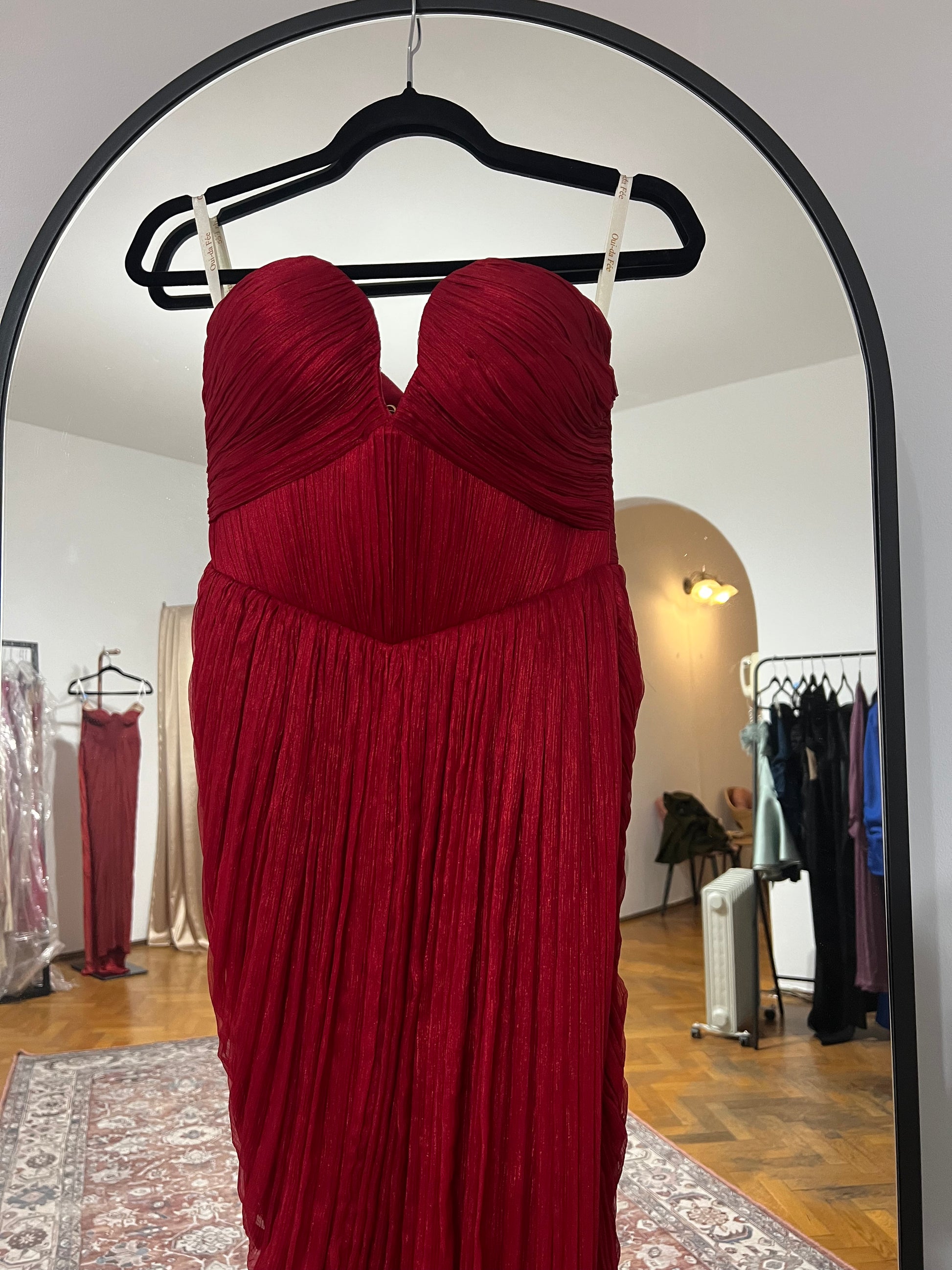 Materialul plisat cu irizații subtile creează un joc elegant de texturi, iar drapajele atent lucrate conturează armonios bustul și talia. Decolteul în formă de inimă, completat de liniile fluide ce coboară pe șolduri, cascădează grațios spre șlițul frontal, oferind un plus de feminitate și mobilitate. Croiul tip sirenă alungește linia corpului și pune în evidență perechea preferată de pantofi.